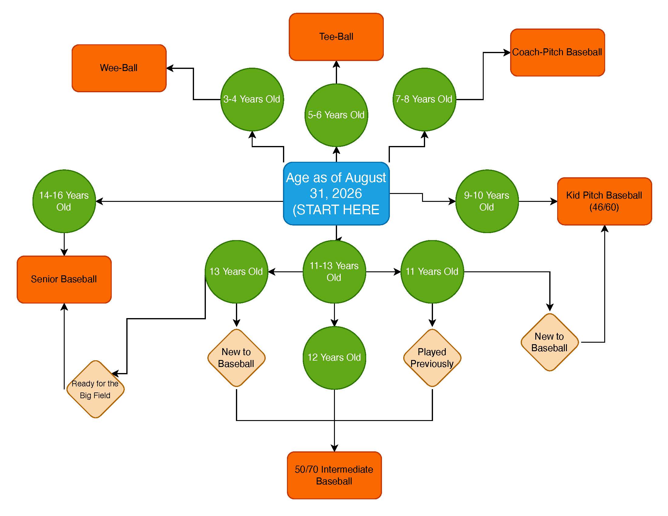 11-year-olds have the choice between Intermediate (50/70) and Baseball (46/60). Age 11 players that have more experience playing baseball should play Intermediate (50/70), as this division will challenge their baseball skills to grow and to overcome new challenges within the game that will acquaint them as a good next step into Middle School.